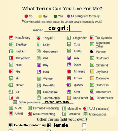 my pronouns are she/her/her, caw/crow/caws, ve/ver/vis and he/him/his (NO they/them! i will not get on your ass about it, but i do NOT use that set.)